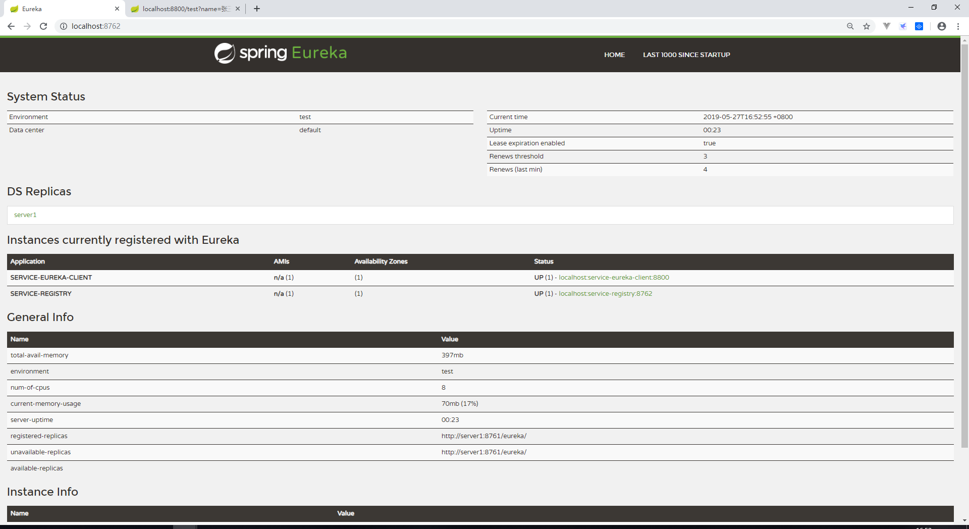 启动第一个项目肯定会报错,因为互相注册导致无法找到另一个服务,不用惊慌,把两个服务全部启动。访问http://localhost:8761或http://localhost:8762 ,DS Replicas显示为另一个服务