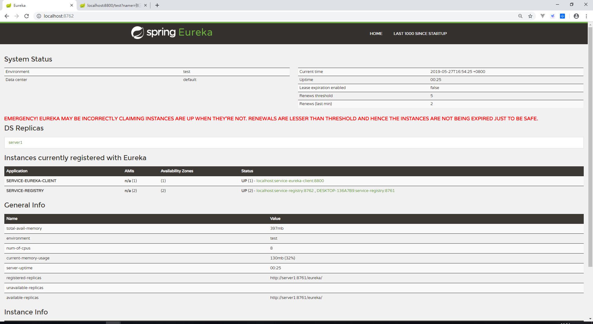 下面我们再次开启server1的eureka-server服务,访问http://localhost:8762