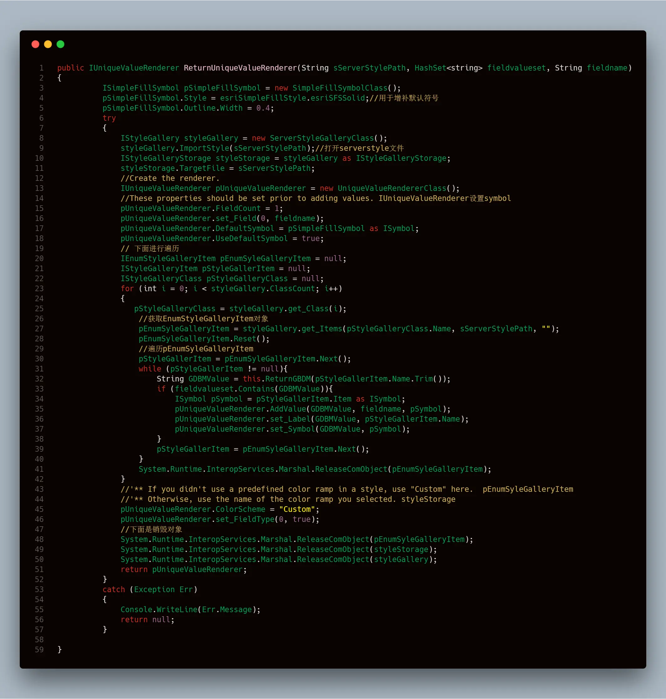 根据字段,系统需要找出对应的符号进行渲染,思路为使用ServerStyleGalleryClass生成对象读取文件,之后转换为IStyleGalleryStorage类型。之后对IUniqueValueRenderer类型对象进行配置。之后使用IEnumStyleGalleryItem进行遍历然后将对应的符号查询出来填入IUniqueValueRenderer中最后返回一个IUniqueValueRenderer对象用于填充即可。主要代码如下: