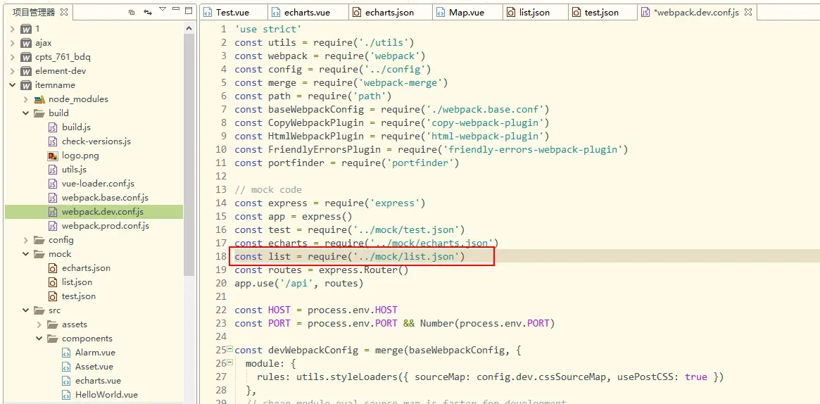 2:在build目录下找到webpack.dev.conf.js文件,编写以下代码