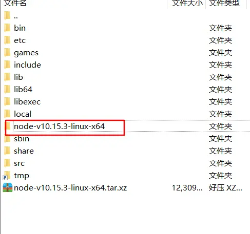 解压后的目录结构,多了个node-v10.15.3-linux-x64目录