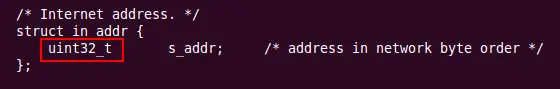 对于IPv4协议,地址是32位的,也就是四个字节,所以该结构体为无符号的32位整数: