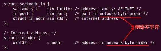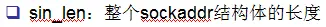 【注意】:平常编程时,只会用到sa_family_t、in_port_t、struct in_addr这三个字段。