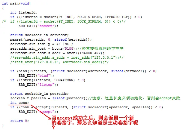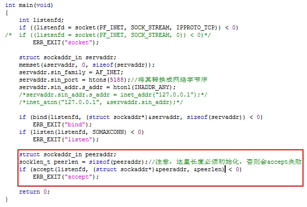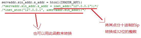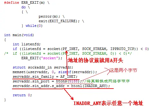 另外,其实"servaddr.sin_addr.s_addr = htonl(INADDR_ANY);"这种写法是可以省略掉的,因为它是全0,但这里为了显示说明所以保留。