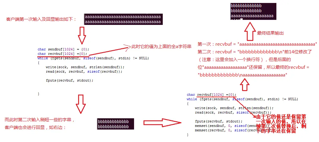 也就是第一次客户端输入很长的字符串,而第二次输入很短的字符串时,这时就会输出有问题,照理应该是客户端输入什么,服务端就会回显给客户端,也就是打印两条一模一样的语句,产生这样的问题原因是什么呢? 下面来用图来分析一下: