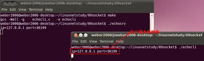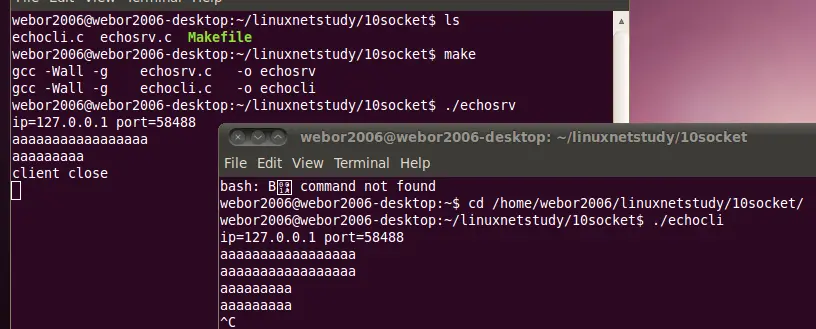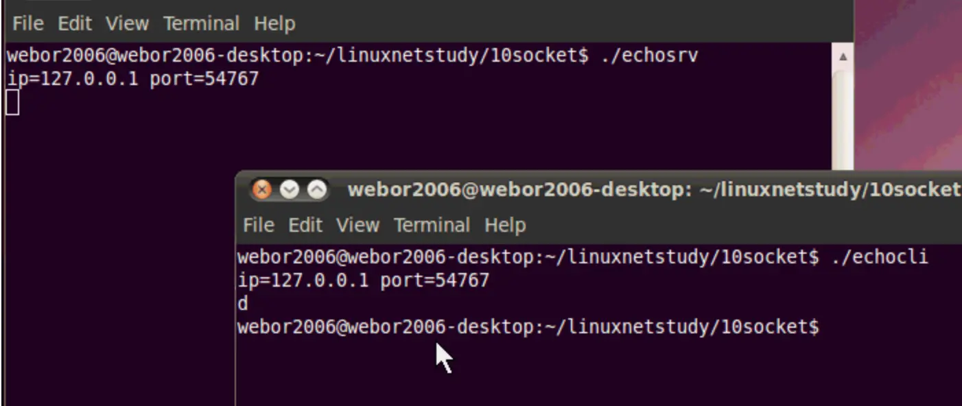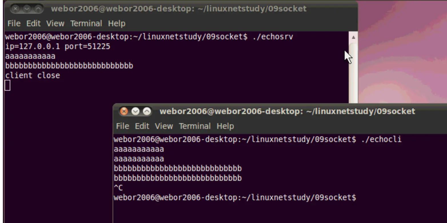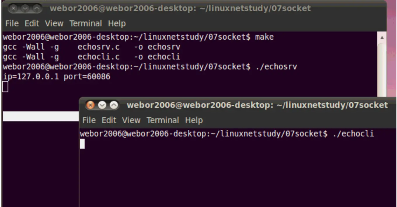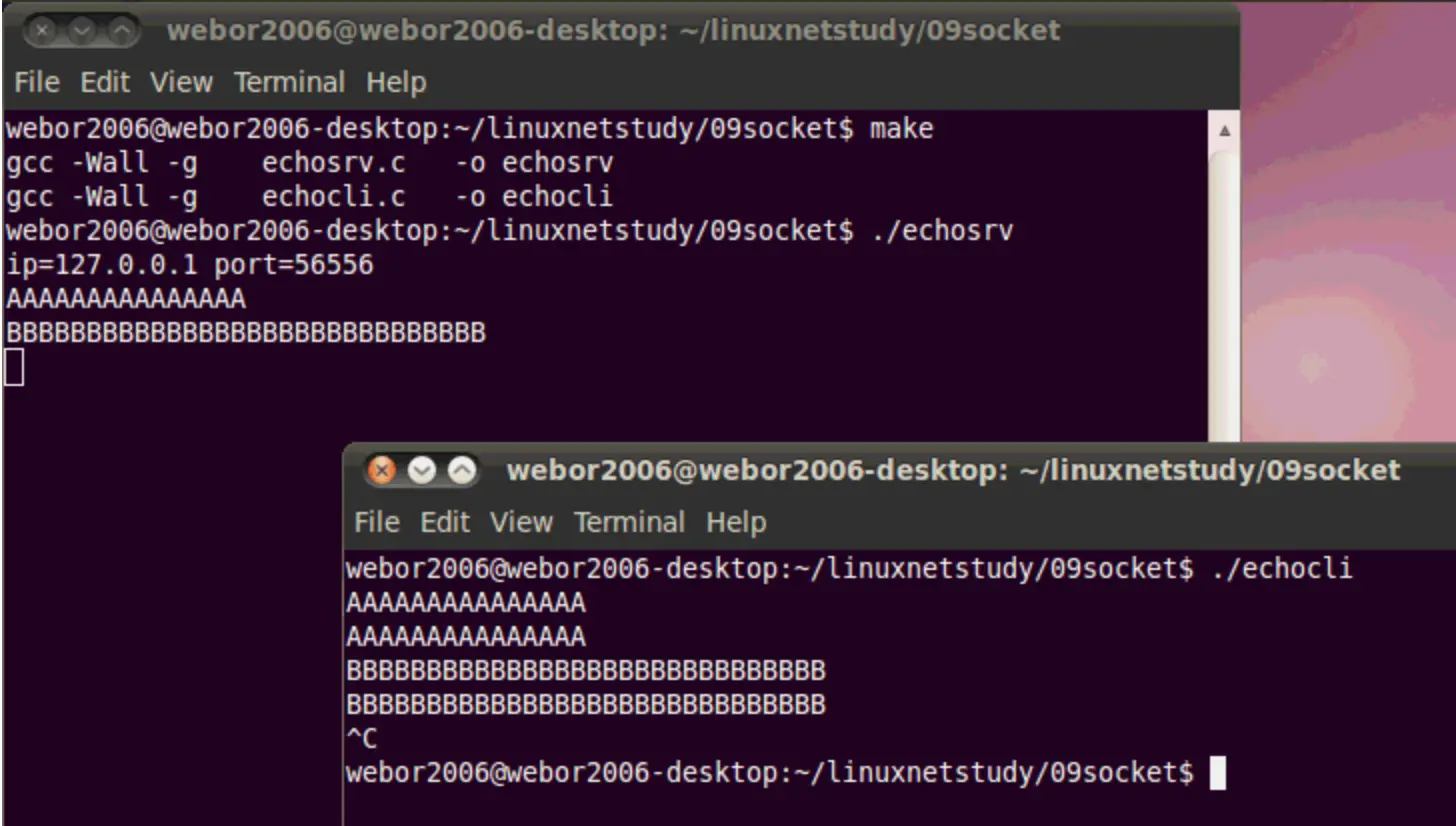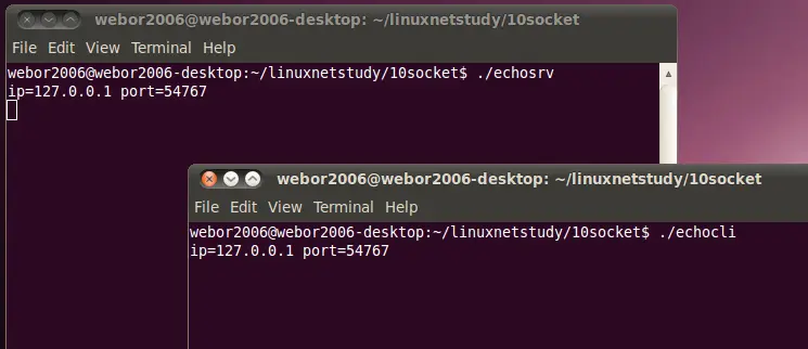 这个例子的效果就是:客户端从命令行获取一行命令,然后发送给服务器端,当服务端接收到这行命令之后,不做任何操作,将其又回送给客户端,然后客户端进行回显,下面则开始一步步来实现这样的效果,来初步感受下Socket编程: