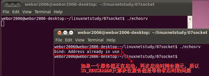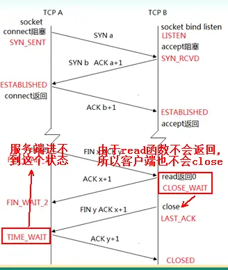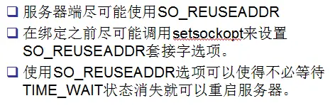 另外这个状态上面也提到了,会保留2倍的MSL时间才会消失,如果服务器端保留两倍的MSL时间,这时候就会导致服务器端无法重新启动,如果没有调用SO_REUSEADDR话。