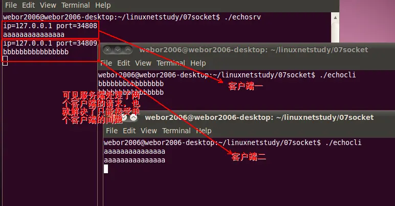 对于服务端程序是不需要进行修改的,只需修改客户端创建五个套接字既可,修改客户端程序如下: