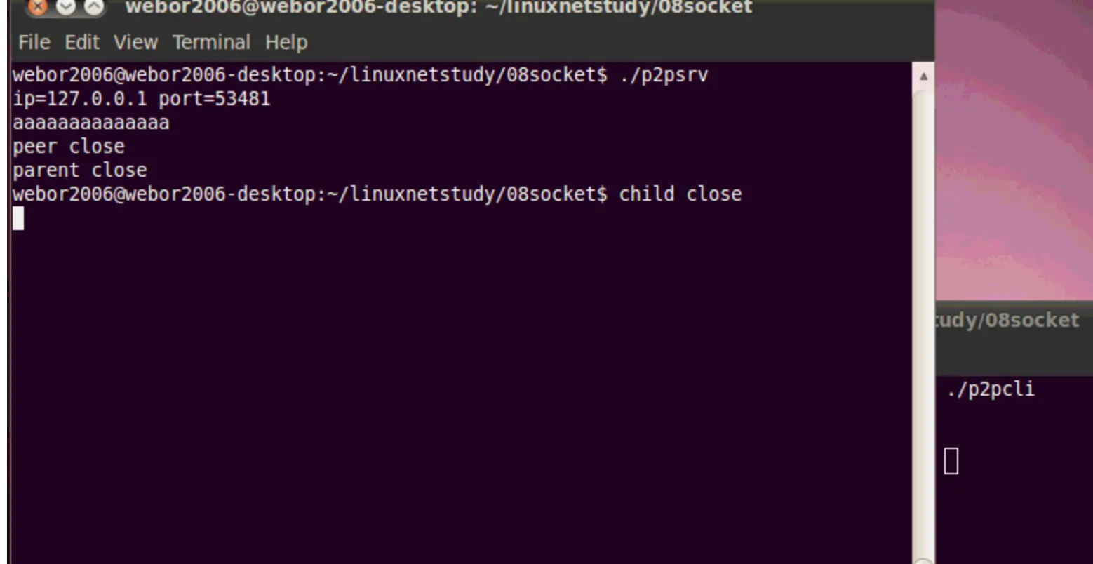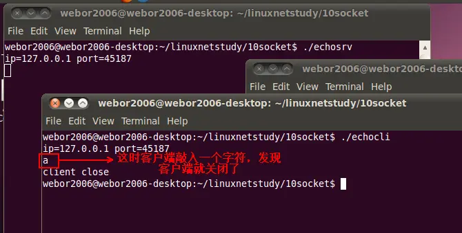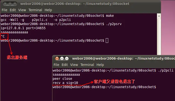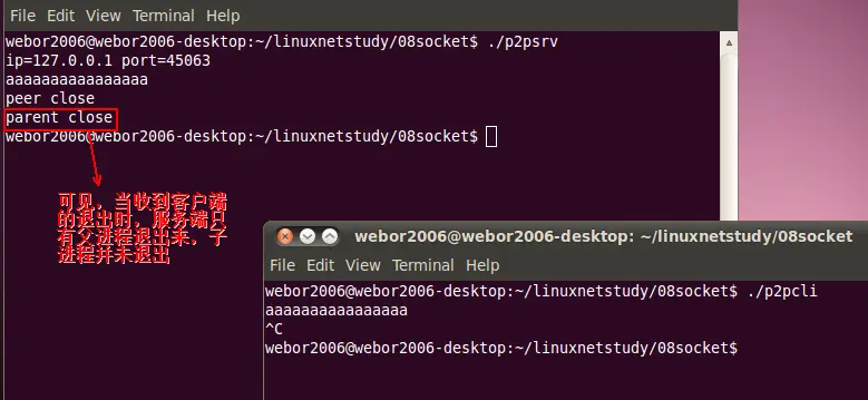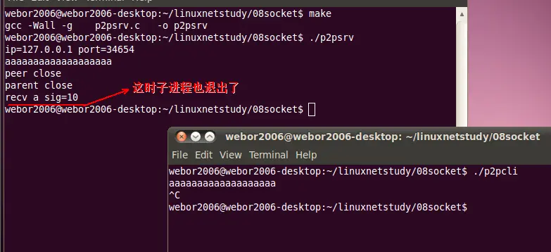 再次编译运行,这一次运行步骤还跟上次一样,需要先杀掉父进程,然后再在客户端敲入一个字符,这里就不说明了,只看一下结果: