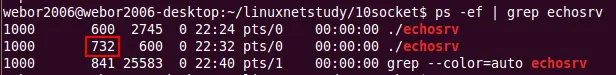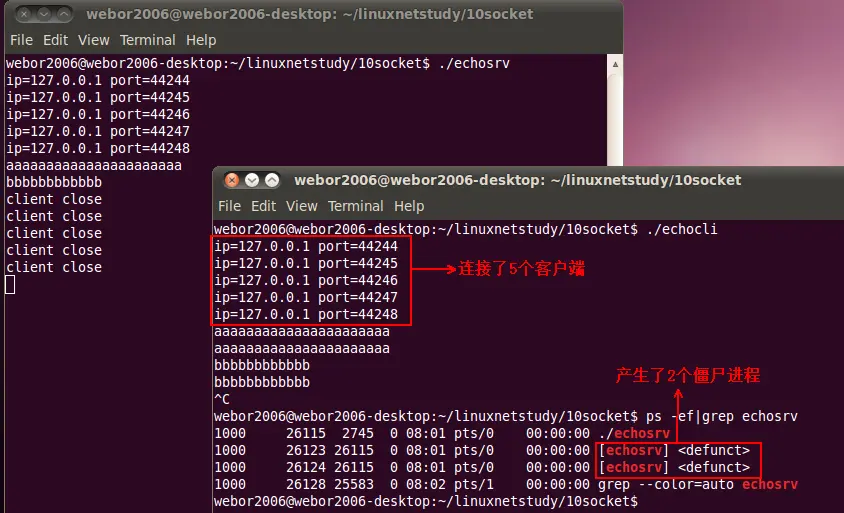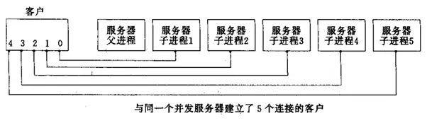 客户端创建五个套接字来连接服务器,一旦连接了服务器就会创建一个子进程出来为客户端进行处理,从图中可以看,服务端创建了5个子进程出来。