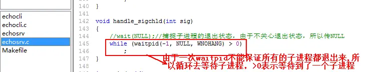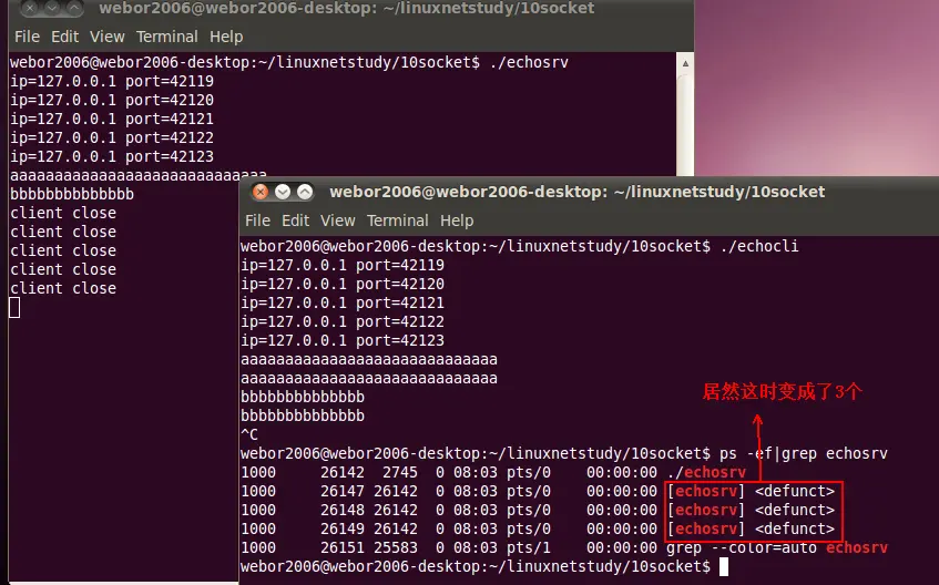 原因可能跟FIN(客户端在终止时,会向服务器发送FIN)到达的时机有关,服务器收到FIN的时候,返回等于0就退出了子进程,这时就会向服务器发送SIGCHLD信号,如果这些信号都是同时到达的话,那么就有可能只处理一个,这时就会出现了4个僵尸进程;如果不是同时到达,handle_sigchld()函数就会执行多次,如果被执行了两次,捕捉到了两个信号的话,那就此时就会出现3个僵进程,以此类推,但不管结果怎样,都是属于需要解决的情况。