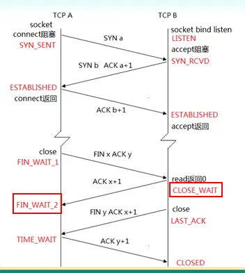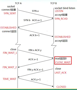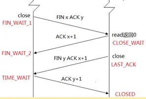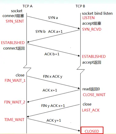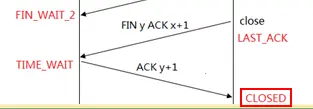 注意:这个状态要保留2倍的MSL(tcp最大的生命期)时间,为什么呢,这个可以简单说明一下,是由于最后一个"ACK y+1"发送过去,不能确定对方收到了,这个ACK可能会丢失,有了这个时间的存在就确保了可以重传ACK,当然还有其它的原因,这里先了解一下既可,当服务器收到了最后一个确认以后,则就处于CLOSED状态了: