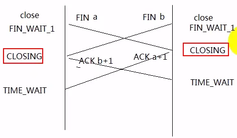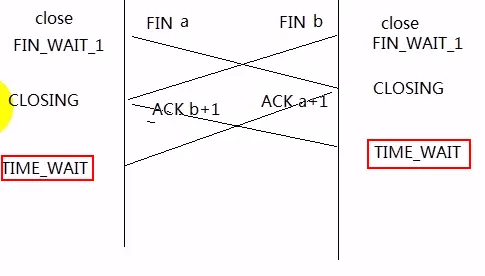 以上是TCP的十点状态,还有一个特珠状态叫CLOSING,它产生的原因是:双方同时关闭,如下图: