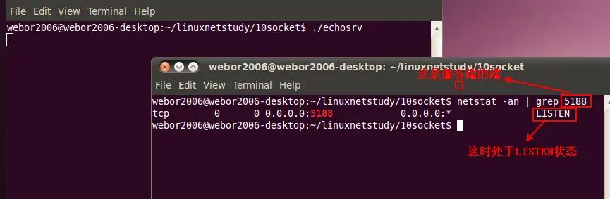 说了这么多理论,下面用代码来进行论证,以便加强理解,还是用之前的服务端/客户端回显的例子,首先启动服务端,这时查看下状态: