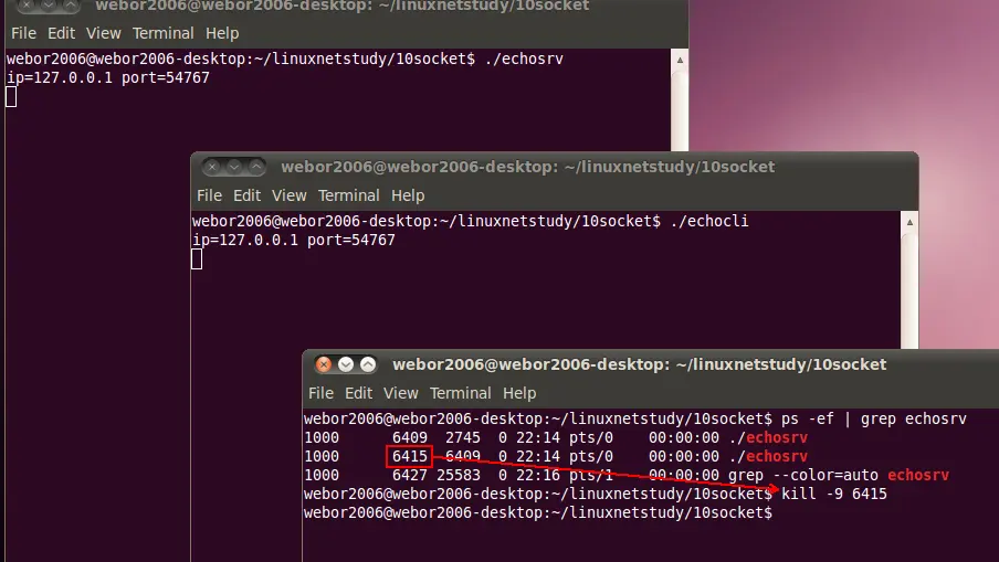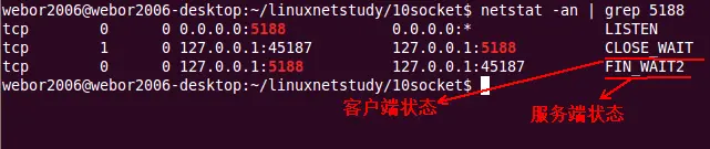 下面来看下连接终止的状态,先关闭服务端,首先找到服务端的进程,通过kill掉的办法来关闭服务端: