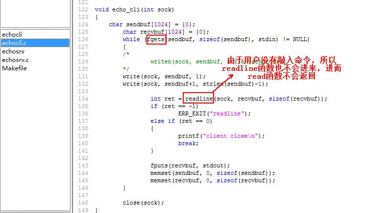这时应该查看一下客户端的程序才知道问题,客户端此时是阻塞在fgets函数来键盘的消息: