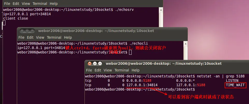 由于目前做实验是在同一台机器上进行的,所以打印了三个状态,实际上应该是服务端的状态和客户端的状态是分开的。