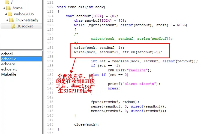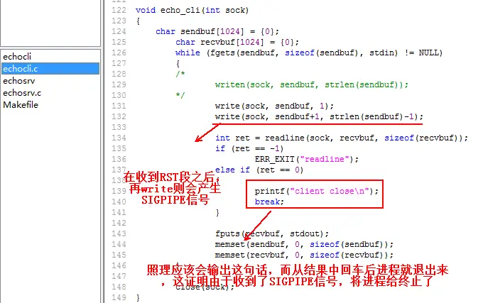 而如果发送数据给对方,但是对方进程又已经不存在,会导致对方发送一个RST重启TCP段给发送方(这里指的就是上面做实验的客户端),但是在收到RST段之后,如果再调用write就会产生SIGPIPE信号,而产生该信号默认就会终止程序,下面来修改一下客户端的代码,还是基于上面的实验,如下: