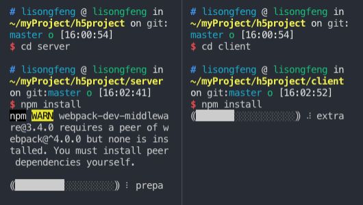 接下来,分别安装前端和服务端的依赖。左、右终端窗口分别进入server和client目录,并运行npm install安装依赖: