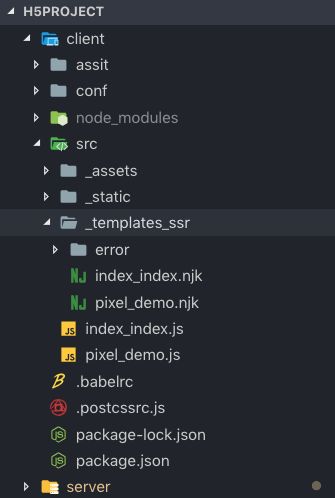 如图所示,src目录下面有一个Webpack的入口文件:index_index.js,而在模板目录_templates_ssr中,有一个同名但不同扩展名的index_index.njk文件(njk就是Nunjucks的简写)。
