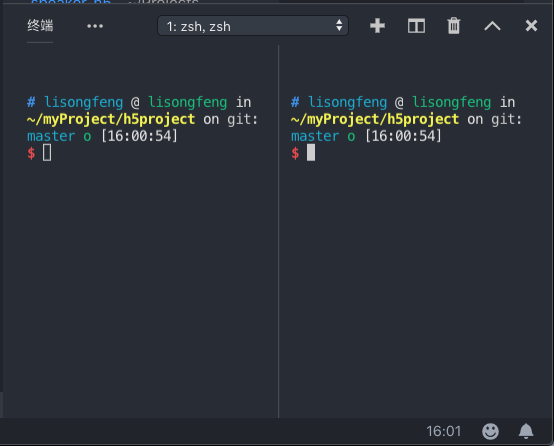 VSCode启动后,按快捷键Ctrl+`切换到终端,再按Cmd+\拆分终端(或者鼠标点击图标进行拆分),结果如下: