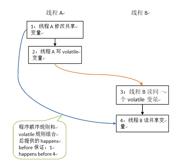 - 根据 happens before 的传递性规则,1 happens before 4。 上述 happens before 关系的图形化表现形式如下: 在上图中,每一个箭头链接的两个节点,代表了一个 happens before 关系。黑色 箭头表示程序顺序规则;橙色箭头表示 volatile 规则;蓝色箭头表示组合这些规则 后提供的 happens before 保证。 这里 A 线程写一个 volatile 变量后,B 线程读同一个 volatile 变量。A 线程在写 volatile 变量之前所有可见的共享变量,在 B 线程读同一个 volatile 变量后,将立 即变得对 B 线程可见。 volatile读写时就是几个线程通过主内存进行通信