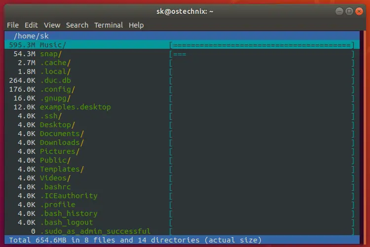 如你在上述输出所见,ls 子命令查询 duc 数据库并列出了所提供目录包含的文件与目录的大小,在这里就是 /home/sk/。