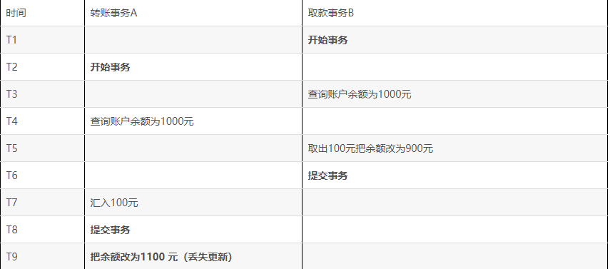 我们可以看到,上面的事务A在更新数据之前,数据已经被事务B所修改,但是事务A最终提交的时候,将事务B的提交覆盖掉了,导致了事务B的更新丢失。