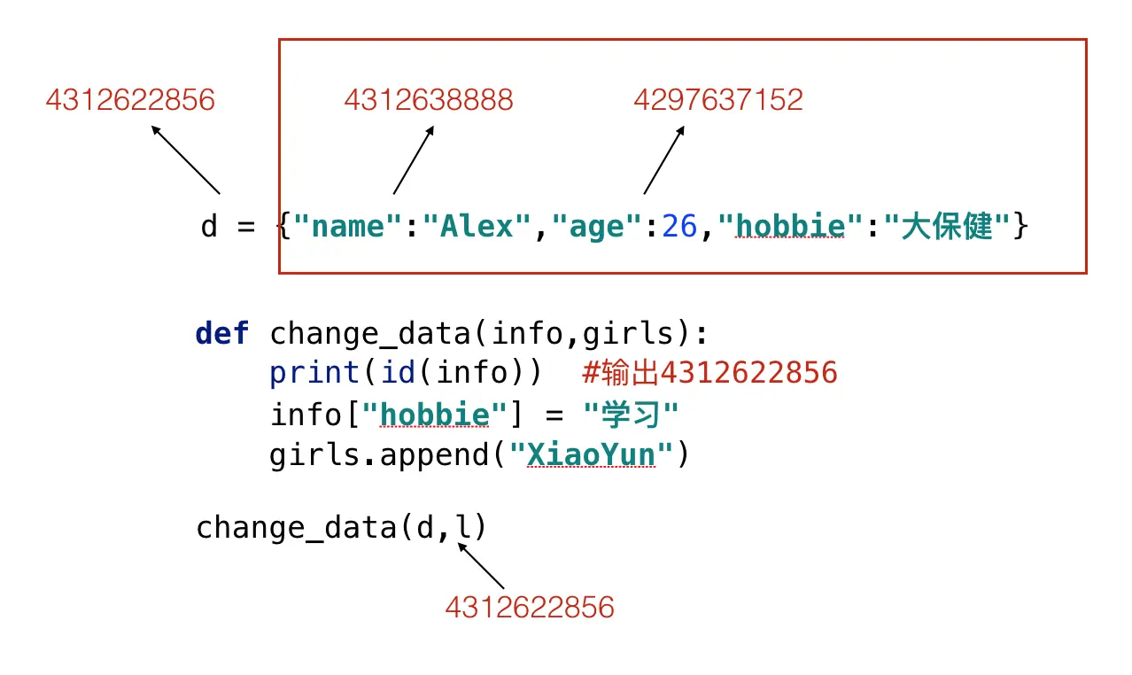 传递列表、字典、集合产生的现象 d = {"name":"Alex","age":26,"hobbie":"大保健"} l = ["Rebeeca","Katrina","Rachel"] def change_data(info,girls): info["hobbie"] = "学习" girls.append("XiaoYun") change_data(d,l) print(d,l) 执行结果{‘name’: ‘Alex’, ‘age’: 26, ‘hobbie’: ‘学习’} [‘Rebeeca’, ‘Katrina’, ‘Rachel’, ‘XiaoYun’]