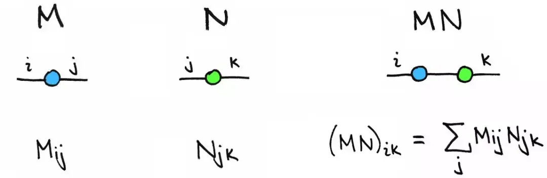 在上图中,具有相同索引 j 的边是缩并的边。这与两个矩阵只有在输入/输出维度匹配时才能相乘的事实是一致的。你还会注意到结果图片有两个自由索引,即 i 和 k,它们确实定义了一个矩阵。