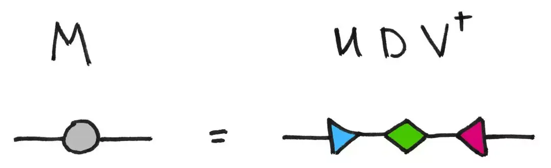 这里,U 和 V 是一元矩阵,所以是等距矩阵,也是三角形。矩阵 D 是一个对角矩阵,我喜欢用一个菱形来表示。总之,矩阵分解是将一个节点分解为多个节点;矩阵乘法是将多个节点融合为一个节点。