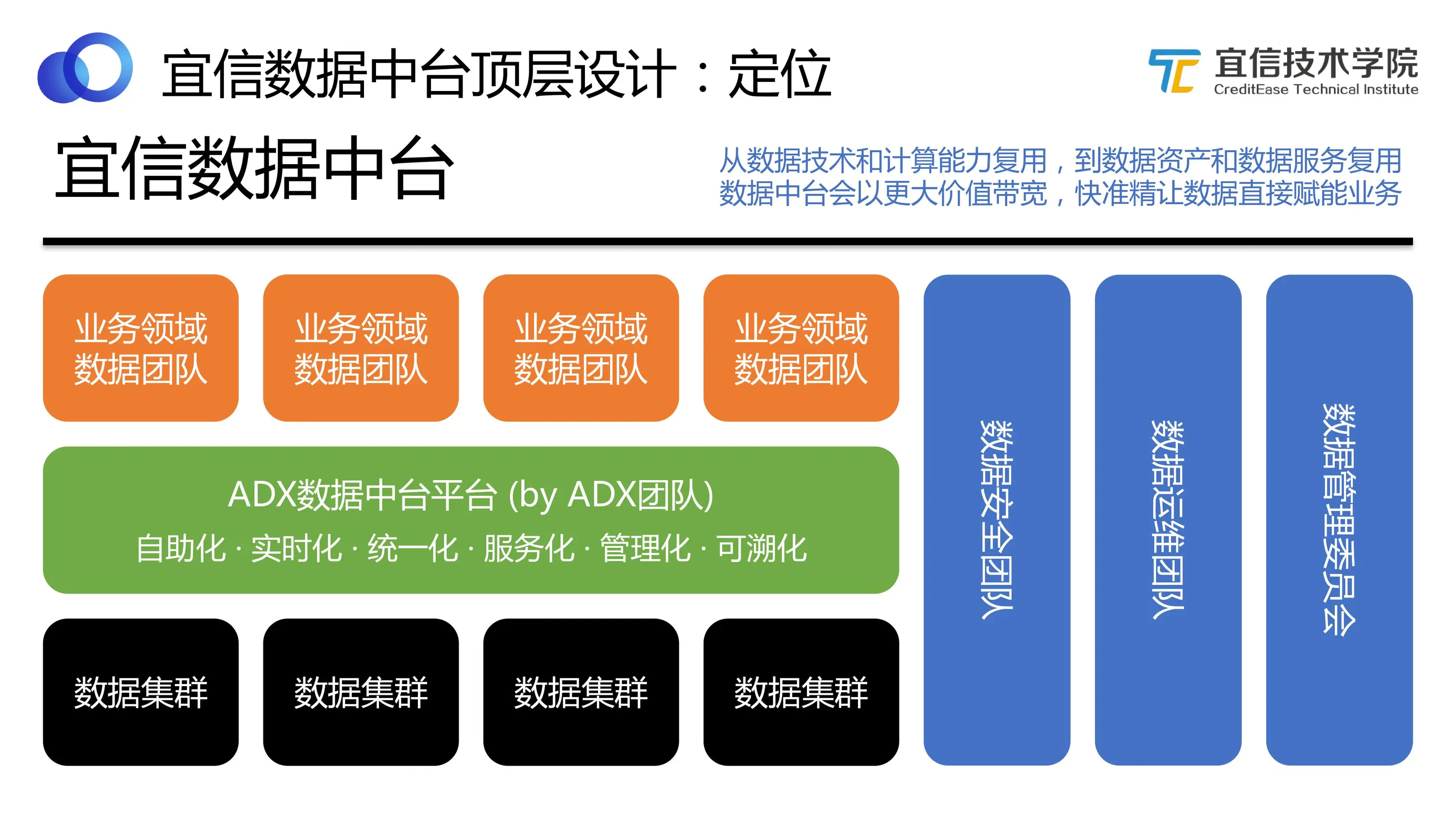 我们对宜信敏捷数据中台的定位是:从数据技术和计算能力复用,到数据资产和数据服务复用,敏捷数据中台会以更大价值带宽,快、准、精让数据直接赋能业务。