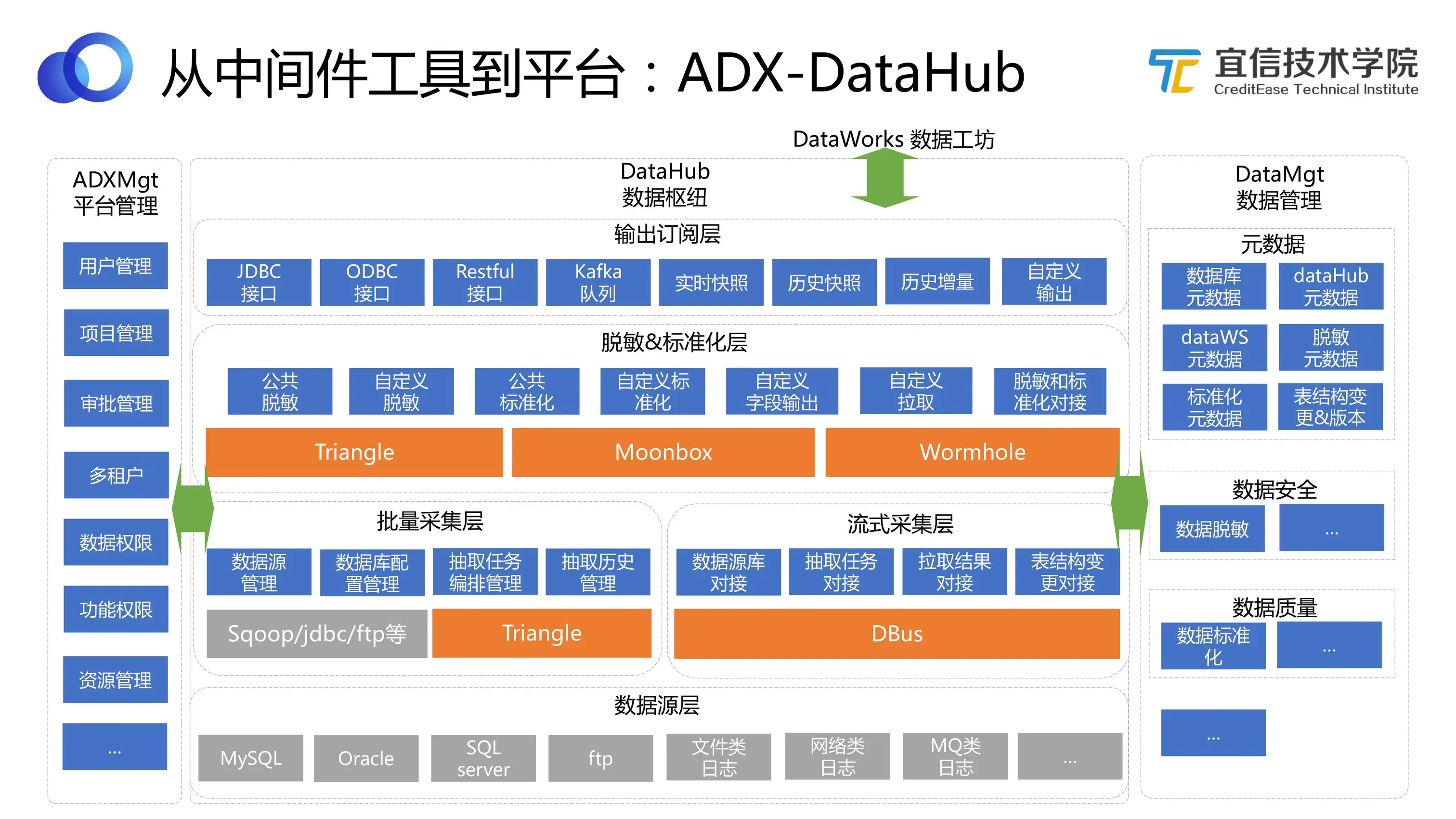 中间件工具指DBus、Wormhole、Moonbox、Davinci四大开源平台,它们从敏捷大数据(ABD,Agile BigData)理念中抽象而出,组成ABD平台栈,敏捷数据中台则被我们称为ADX(Agile Data X Platform)。也就是说我们经历了从ABD到ADX的过程。