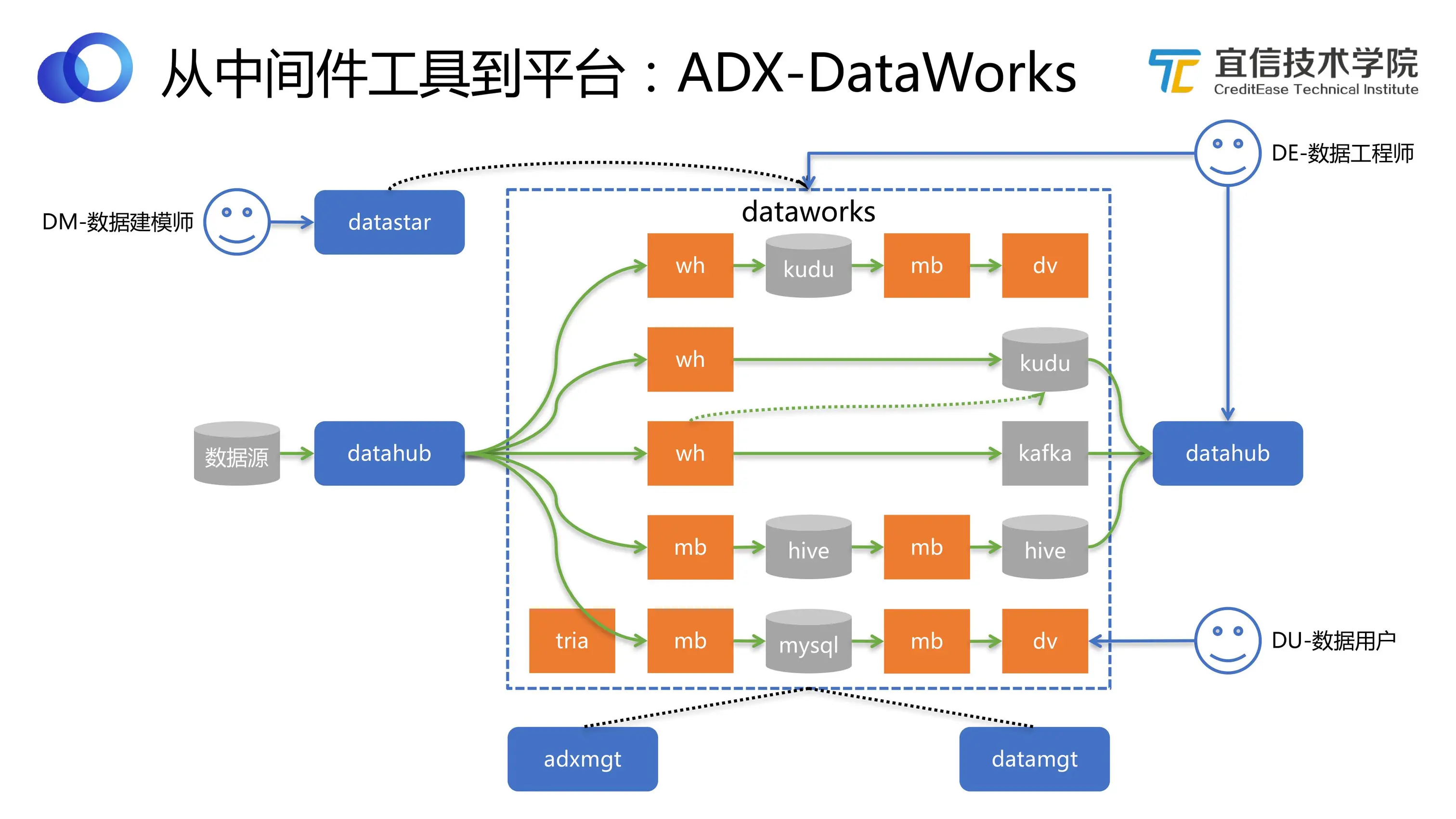 平台维度。每个蓝色的方框都代表一个技术模块,整个宜信敏捷数据中台就是由这些技术模块组合而成。其中DataHub数据枢纽,可以帮助用户完成自助数据申请、发布、脱敏、清洗和服务等;DataWorks数据工坊,可以对数据进行自助查询、作业、可视化等处理;还有DataStar数据模型、DataTag数据标签、DataMgt 数据管理、ADXMgt 中台管理等。