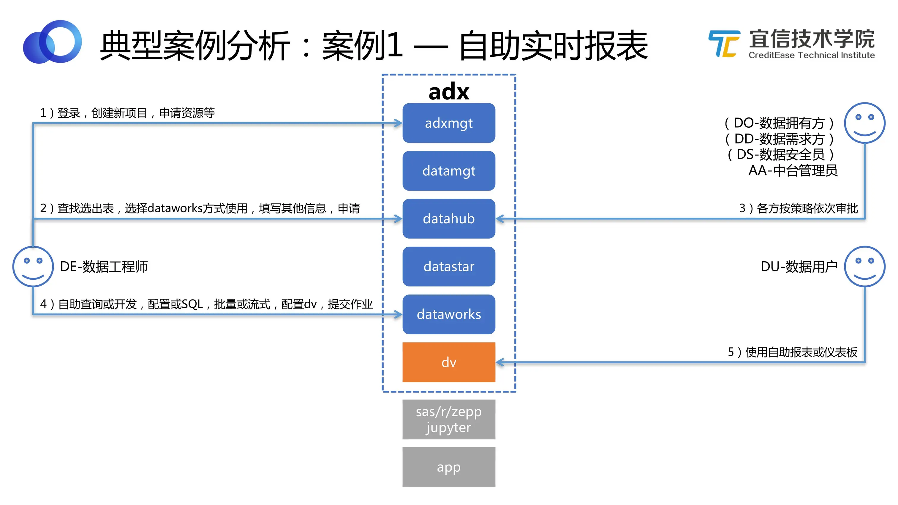 这个案例比较简单,一个完备的数据中台,不仅有应用客户场景,还有管理客户场景,管理客户典型的比如数据安全团队和数据委员会。