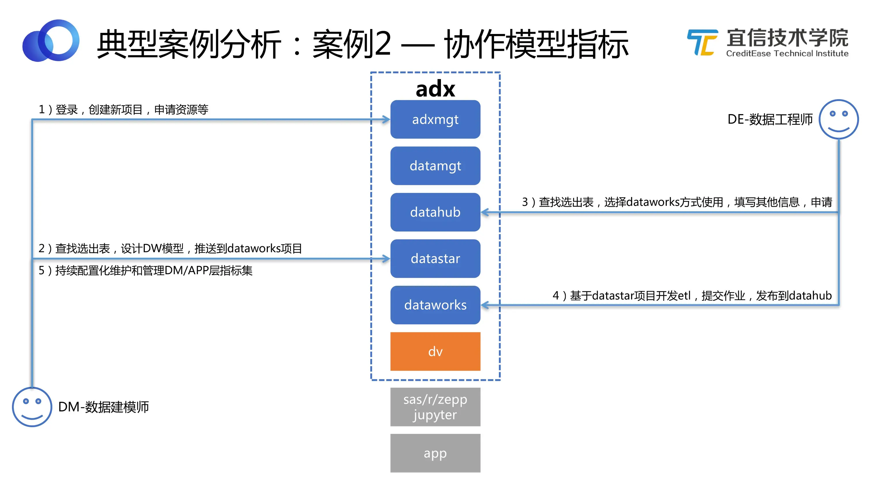 A:我们的建模方法论也是基于著名的《数据仓库工具箱》来指导建设的,并且根据宜信实际情况,对Kimball的维度建模进行了一定的简化、标准化、通用化设计,同时也参考了阿里的OneData体系的经验,这块我们并无太多独创性。DataStar更重要的目标,还是如何易用、有效的吸引和帮到数据建模师,从流程上能够让模型建设统一化、线上化、管理化,同时力求减少ETL开发人员负担,将DW到DM/APP层的个性化指标工作通过配置化下放给非数据开发人员自助完成。所以DataStar整体上还是以管理和提效为主要目标的。