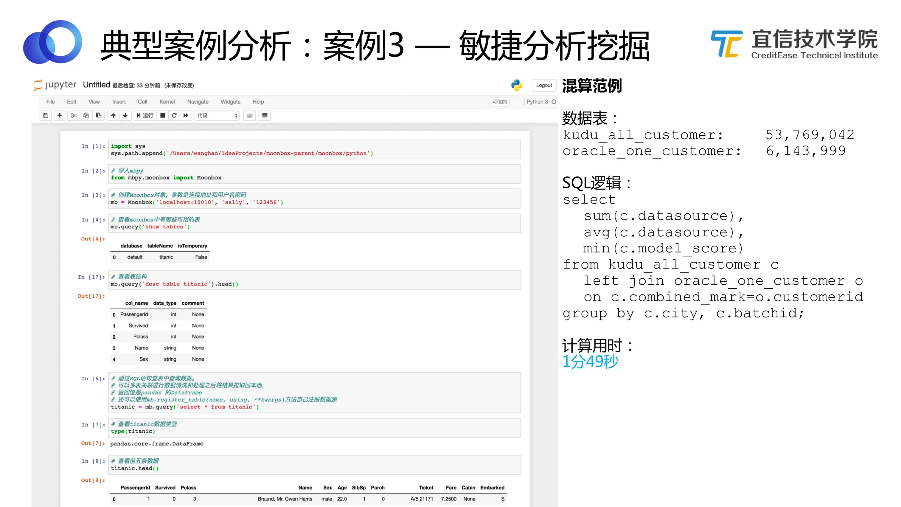 举个例子,一个用户打开Jupyter,import一个mbpy的库包,并以用户身份登录Moonbox,就可以查看管理员授权给他的表。他可以运用拿到的数据和表进行分析、计算等,而不需要关注这些数据来自哪里,这对用户来说是一个无缝的体验。