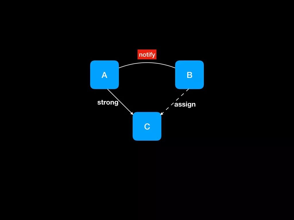 A对C对像是强持有, B对C对象的申明是assign, 当A释放了C以后, B在调用C的xxx方法就会野指针crash. 对于开发者来说, 很少会把对象申明成assign, 所以这种写法引发的crash是比较好排查的, 下面看另一种示意图.