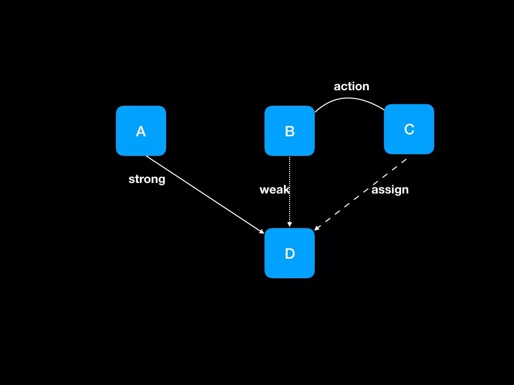 这里B对D是弱引用, C对D是assign引用, 笔者这里示意图里想表明的是C其实是通过B的某些调用才触发对assign对象D的方法调用, 同样的原因唯一对D强引用的A如果在这个过程中释放了D就会造成crash, 说到这里可能会问, 什么场景需要这么费劲的调用, 看上去B也可以直接对D进行调用而且weak不会造成野指针不是吗. 还原一下当时的crash场景.