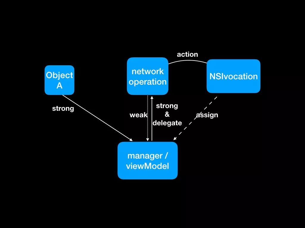 简单说就是A对象通过一个manager(或者viewModel之类的),发出一个网络请求, 图2中的B在这个场景中其实是一个网络库, manager是网络请求的delegate, 负责网络请求之后的回调, 这个网络库在设计的时候为了扩展性考虑在触发回调的时候使用了一个NSInvocation. 关键代码: