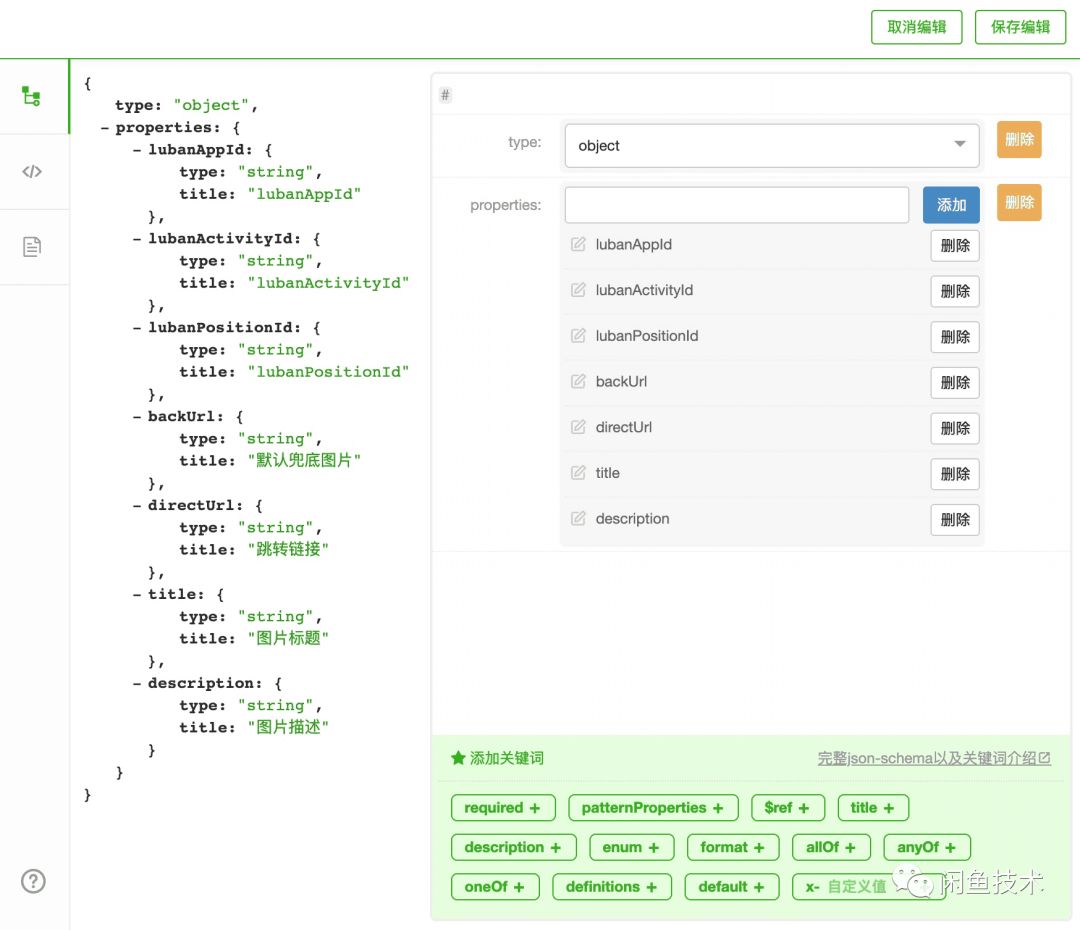 这个 schema 是用 json 描述的。技术同学在前端页面上开发实体资源位后,需要在我们的系统中创建对应的虚拟资源位,并通过一个图形化的 json schema 编辑器来定义这个资源位需要消费的数据结构。