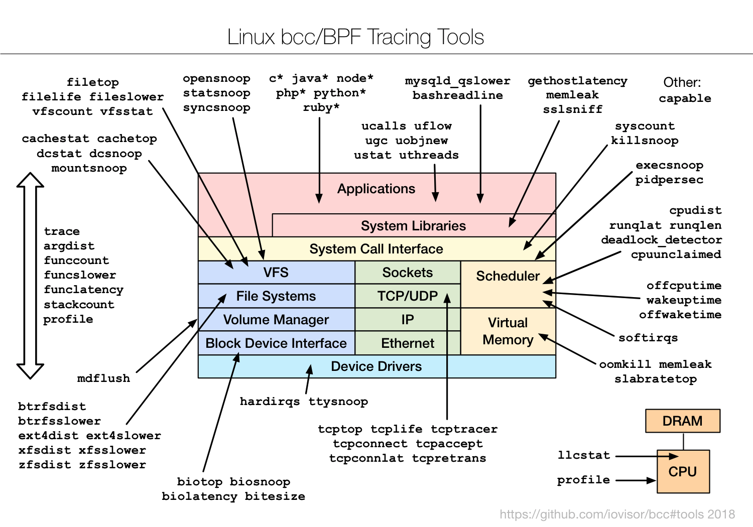 作为初学者,你不必开发 eBPF 代码。bcc 自带超过 70 多个工具可以直接使用。bcc 入门教程里你将接触 其中 11 个工具:execsnoop, opensnoop, ext4slower (or btrfs, xfs, zfs), biolatency, biosnoop, cachestat, tcpconnect, tcpaccept, tcpretrans, runqlat, and profile.