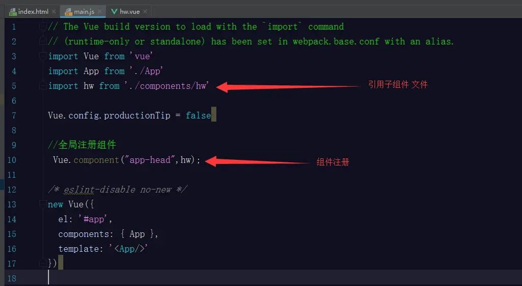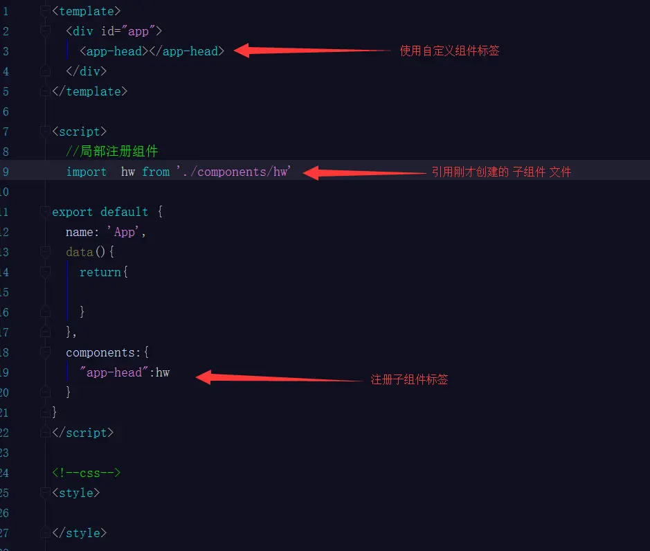1.局部注册组件 :在App.vue文件中注册 也在App.vue文件使用