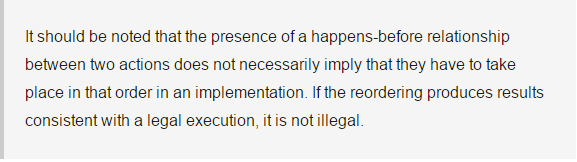 Java中Sequential Consistency的基础,是JVM的happens-before关系。在Java Language Specification的内存模型中,规定了happens-before关系,正确处理happens-before关系,是java语言正确实现并发的基础。显而易见的是,在同一个线程的代码中,前面的action happens-before 后面的action。然而它后面又说,两个action就算有happens-before关系,在实现中也不一定按照这个顺序发生。重新排序后的顺序只要能产生合法的结果,就可以接受。