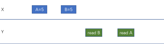 在Y线程中同时读取A和B(实际上java中没法同时原子性的读取两个变量,我们可以先读取B,再读取A),那么有没有可能读取到B=5,A=0呢?直觉上来看,是不可能的。因为X先更新A,后更新B,如果B都读取到了5,那A应该也是5才对。