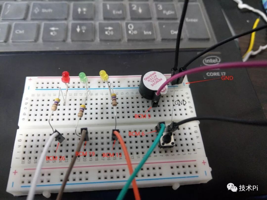 示例的实现效果:当我们按下开关并松开,黄绿红三个led依次亮,红灯亮完后蜂鸣器发出两秒钟声音