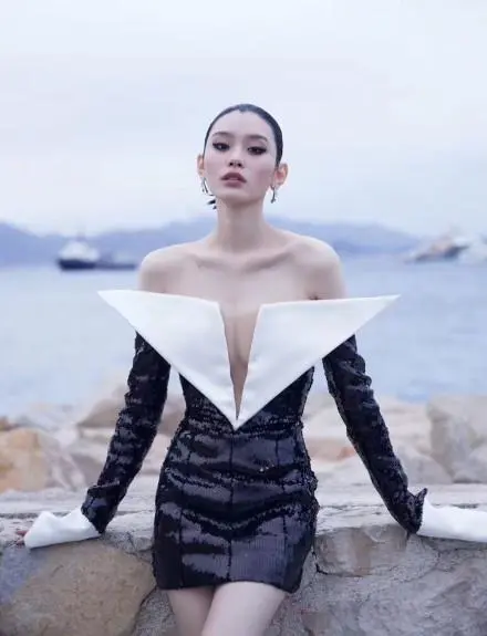第一次奚梦瑶以一套黑白深V连衣超短裙亮相,胸口翅膀样式的设计是整套衣服的亮点所在。