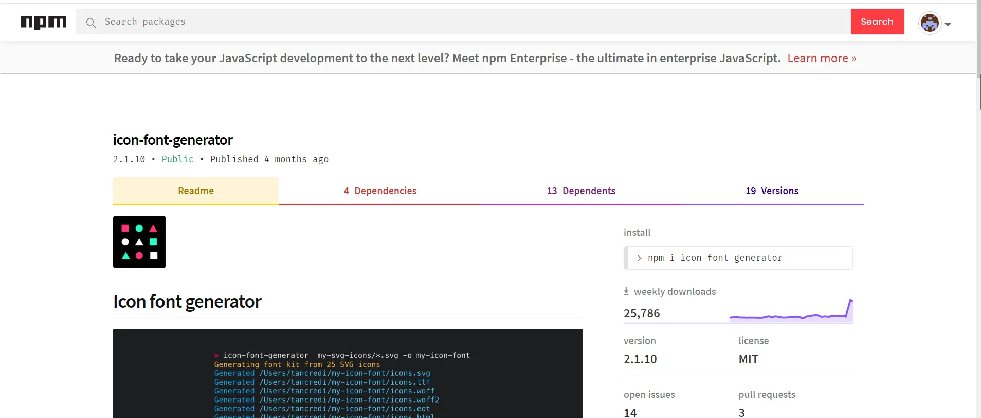- 首先,进入npm官方网站,找到icon-font-generator的使用介绍 www.npmjs.com/package/ico…