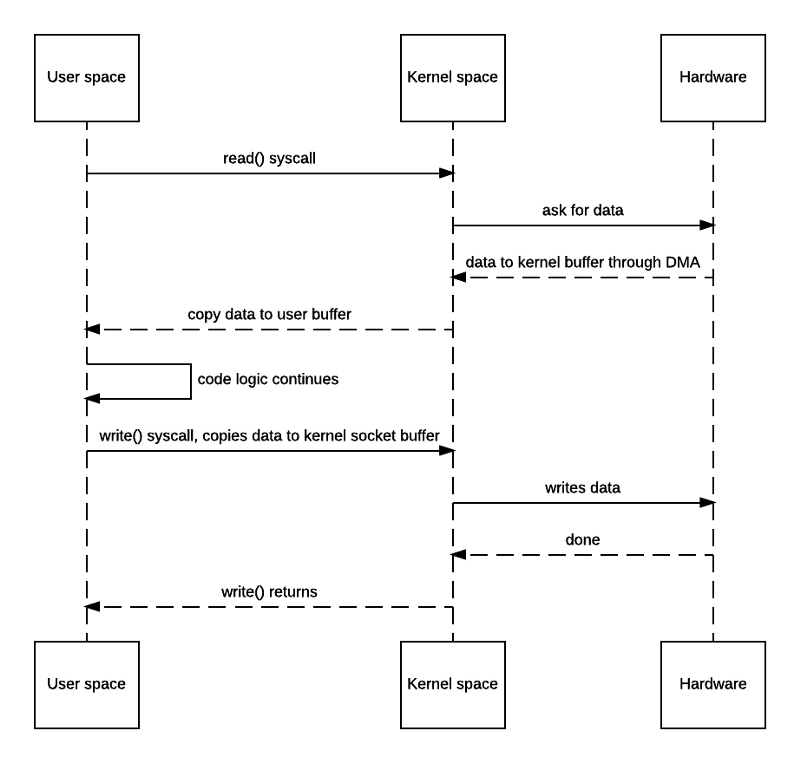 - 操作系统内核把数据从 kernel 拷贝到 用户空间缓冲区,上下文切换到 user 模式,read() 函数退出 (第2次上下文切换,第 2 次数据拷贝)