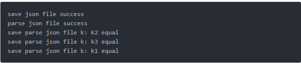 package mainimport ( "github.com/goinbox/gomisc" "fmt")func main() { filePath := "/tmp/test_save_parse_json_file.json" v1 := make(map[string]string) v1["k1"] = "a" v1["k2"] = "b" v1["k3"] = "c" err := gomisc.SaveJsonFile(filePath, v1) if err != nil { fmt.Println("save json file failed: " + err.Error()) } else { fmt.Println("save json file success") } v2 := make(map[string]string) err = gomisc.ParseJsonFile(filePath, &v2) if err != nil { fmt.Println("parse json file failed: " + err.Error()) } else { fmt.Println("parse json file success") } for k, v := range v2 { if v != v1[k] { fmt.Println("save parse json file error, k: " + k + " not equal") } else { fmt.Println("save parse json file k:", k, "equal") } }}